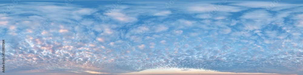 The watermark will not be included on Canvas Print.: Blue sky hdri 360 panorama with pink clouds before sunset with zenith for use in 3d graphics as sky