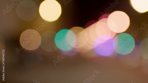 The watermark will not be included on Canvas Print.: Blurry city lights seen from a moving vehicle at night, creating a bokeh effect