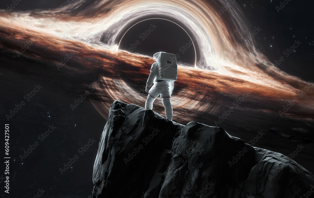 Canvas Prints brave astronaut stands on a rock and looks into the sky at a black hole and deep space. 5k realistic