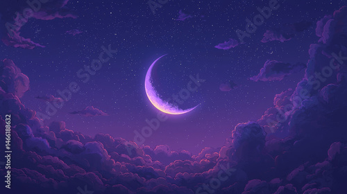 The watermark will not be included on Canvas Print.: Bright crescent moon shining in a violet sky with soft clouds and scattered stars
