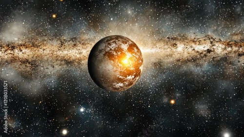 The watermark will not be included on Canvas Print.: Bright planet illuminated against a backdrop of swirling galactic clouds and distant stars in the co