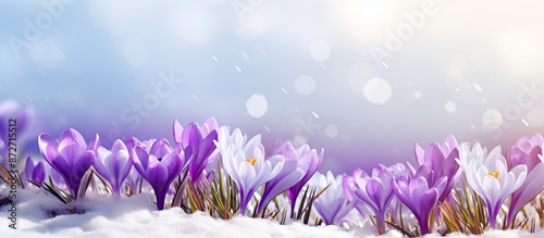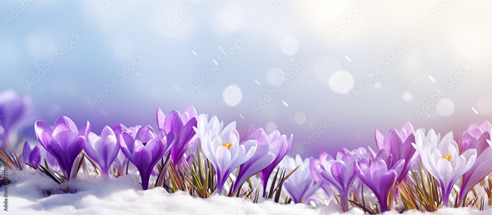 Canvas Prints bright violet spring crocus flowers blooming with copy space image of snow in the background.