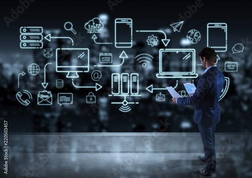 Canvas Prints businessman watching tech devices and icons thin line interface - Canvas Prints Canvas Prints businessman watching tech devices and icons thin line interface - Canvas Prints
