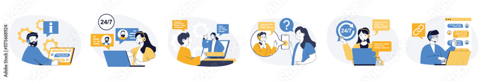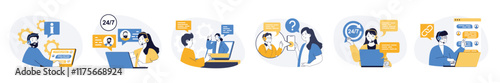 The watermark will not be included on Canvas Print.: Call center concept set in flat web design - collection with people answering calls in helpline and o
