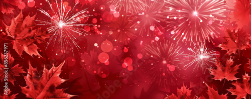 The watermark will not be included on Canvas Print.: Canada day background with a red and white color scheme featuring maple leaves and fireworks -