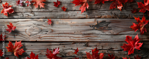 Canvas Prints canada day background with a rustic wooden texture and scattered maple leaves.