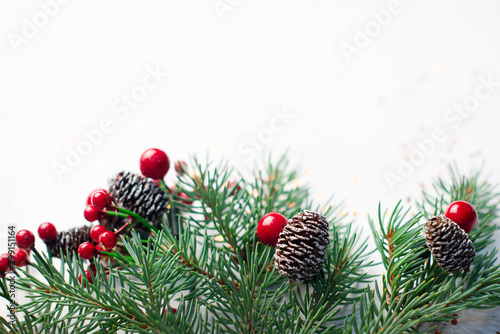 Canvas Prints christmas composition flatlay. spruce branches, red berries on white background with space for text