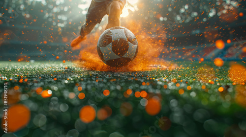 The watermark will not be included on Canvas Print.: Cinematic image of a soccer freestyle player making tricks with the ball on a artificial grass court