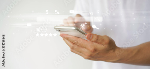 The watermark will not be included on Canvas Print.: Close up man hand touchscreen on smartphone to use search engine optimization (seo) tools for find c