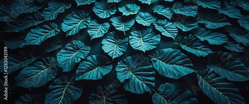 The watermark will not be included on Canvas Print.: Close-up of dark green tropical leaves arranged in a flat pattern with contrasting light and shadows