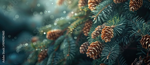 The watermark will not be included on Canvas Print.: Close up of spruce branches with cones providing a vibrant copy space image