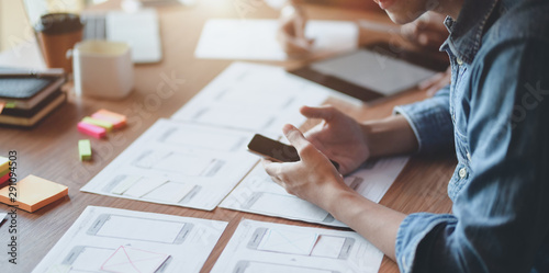 The watermark will not be included on Canvas Print.: Close-up of ux web development plaining the idea on smartphone application together
