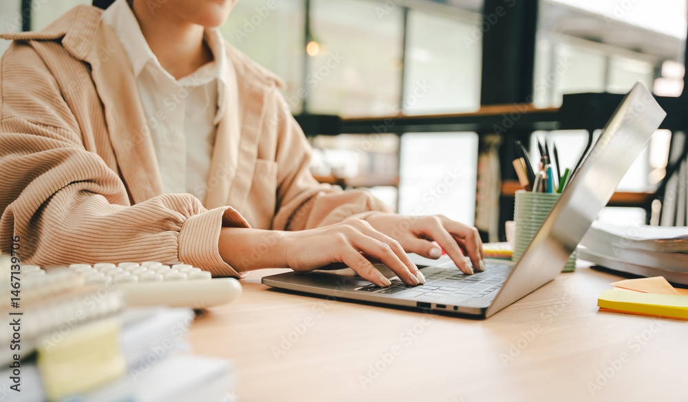 Canvas Print : Close-up portrait typing keyboard on laptop computer - working online on white table at office - faceb
