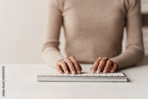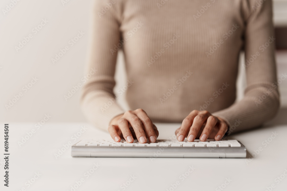 Canvas Print : Close-up portrait typing keyboard on laptop computer - working online on white table at office - faceb