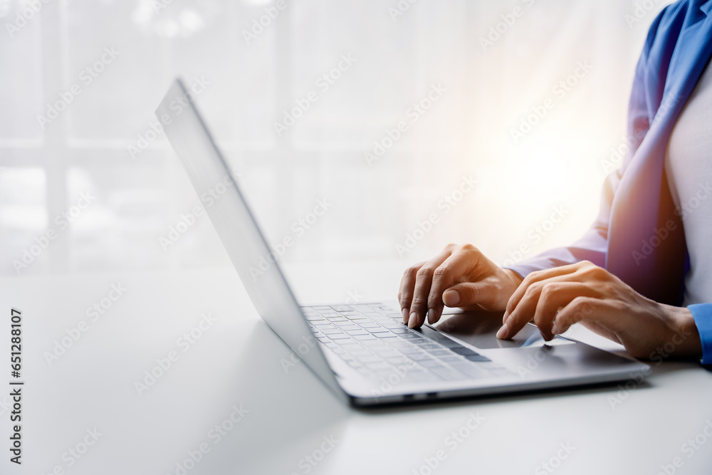 Canvas Print : Close-up portrait typing keyboard on laptop computer - working online on white table at office - faceb