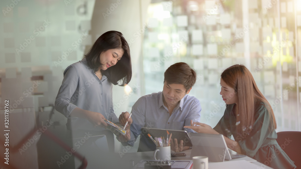 The watermark will not be included on Canvas Print.: Close up view of young professional designer team preparing their project in co working space