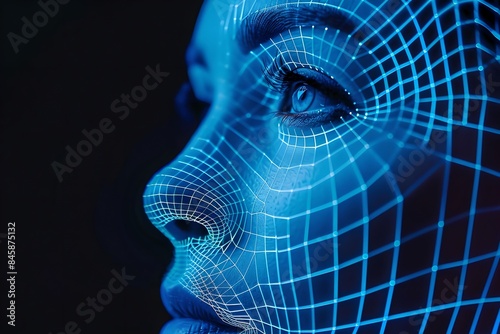 The watermark will not be included on Canvas Print.: Close-up woman portrait with digital biometric grid - face detection and facial recognition - face id