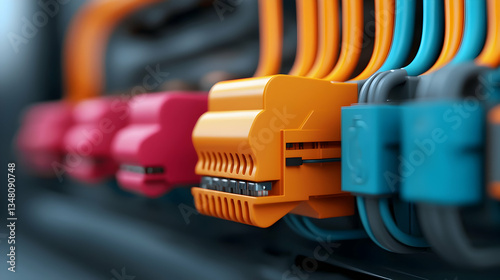 The watermark will not be included on Canvas Print.: Closeup of colorful wires and connectors in technological system