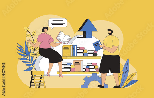 The watermark will not be included on Canvas Print.: Cloud library concept with modern flat design for web - woman and man reading and sharing digital boo