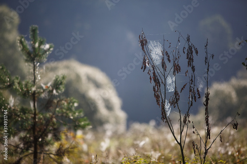 Canvas Prints cobwebs on the grass and branches of trees. the web grid is illuminated by the morning sunlight