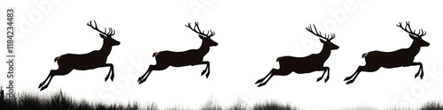The watermark will not be included on Canvas Print.: Collection of minimalist black and white silhouette depicting graceful leaping deer stags in a natur