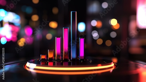 The watermark will not be included on Canvas Print.: Colorful audio visualization with glowing bars on a reflective surface in a vibrant urban setting