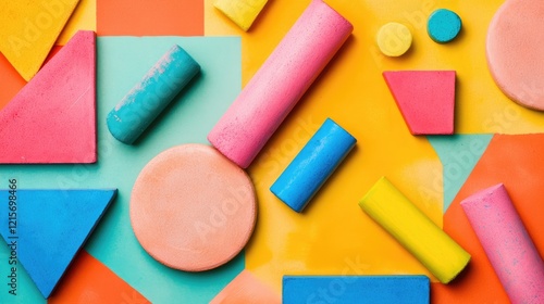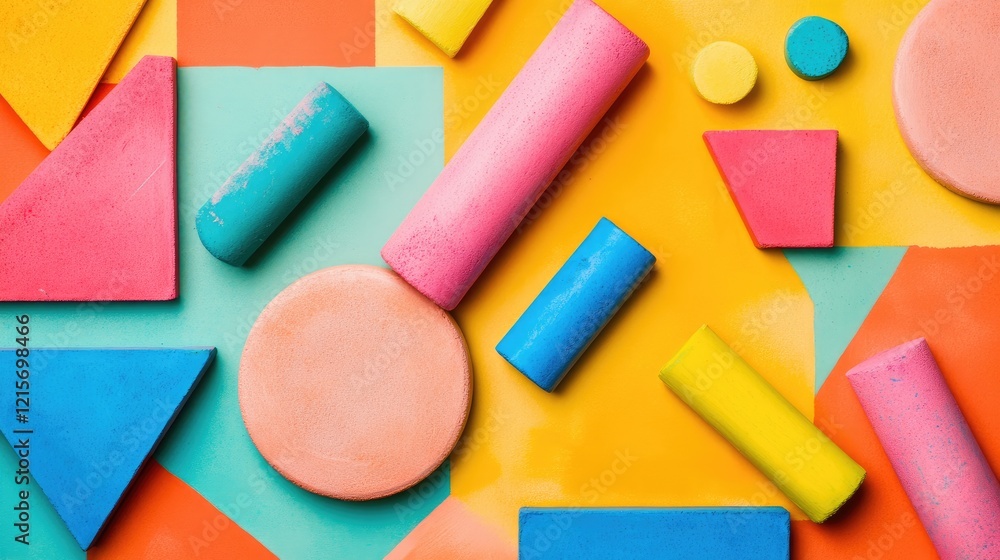 The watermark will not be included on Canvas Print.: Colorful geometric shapes and patterns in vibrant pastel hues on a bright background with ample copy