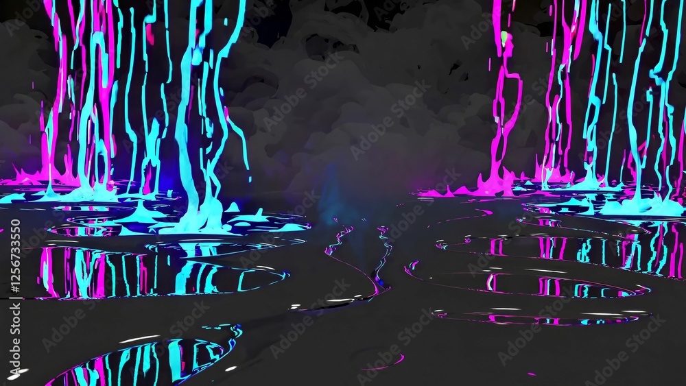 The watermark will not be included on Canvas Print.: Colorful neon fluids are dripping onto a reflective surface, creating a vibrant and dynamic scene wi