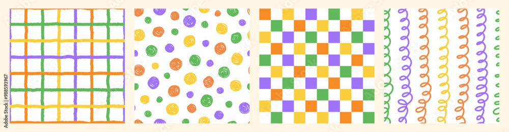 The watermark will not be included on Canvas Print.: Colorful seamless pattern set of hand drawn curved checkered lines, polka dots and strip - trendy des