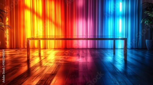 The watermark will not be included on Canvas Print.: Colorful studio lighting reflecting on an empty table