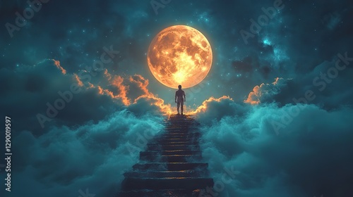 The watermark will not be included on Canvas Print.: Conceptual image of a man climbing a ladder toward a full moon