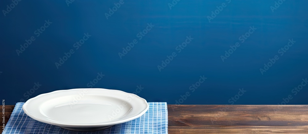 The watermark will not be included on Canvas Print.: Copy space image of a white wooden table with a new blue tablecloth featuring an empty plate on top