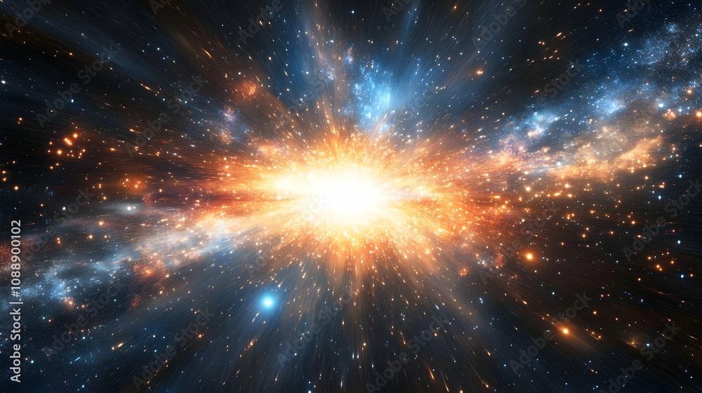 The watermark will not be included on Canvas Print.: Cosmic explosion with glowing stars and streaks of light in a dark space background