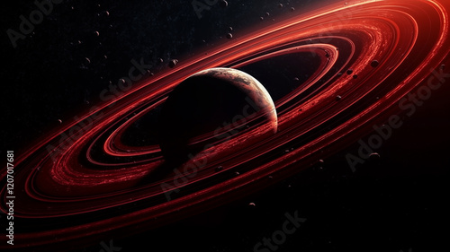 The watermark will not be included on Canvas Print.: Cosmic landscape with rings around a planet and a glowing sun backdrop - generative ai