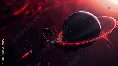 The watermark will not be included on Canvas Print.: Cosmic landscape with rings around a planet and a glowing sun backdrop - generative ai