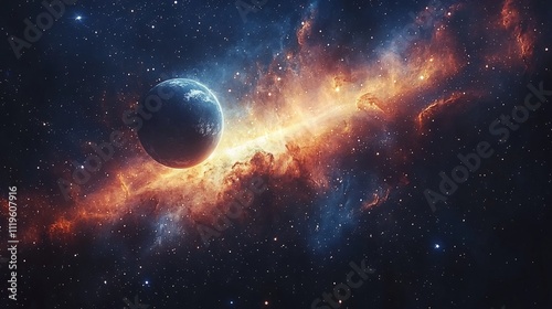 The watermark will not be included on Canvas Print.: Cosmic view of earth and moon orbiting in harmony amidst distant stars and nebulae