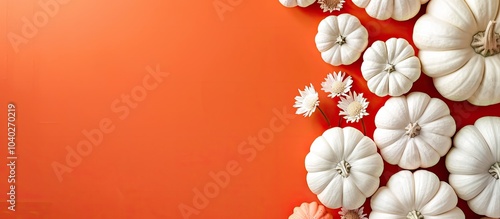 The watermark will not be included on Canvas Print.: Creative top down view of white pumpkin arrangement on an orange backdrop with ample copy space imag