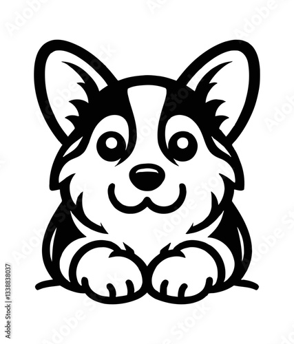 Canvas Print : Cute corgi puppy with front view sitting smiling and happy with detailed black and white vector