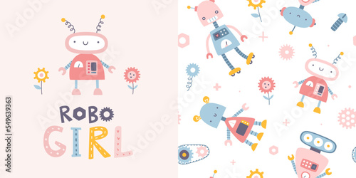 Canvas Prints cute girly pattern with pink robots. seamless vector print set for baby girl textile and fabric.