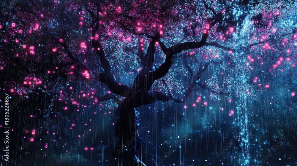 The watermark will not be included on Canvas Print.: Cyber botanical wallpaper with glowing circuit-infused trees and pixel rain in a surreal atmosphere