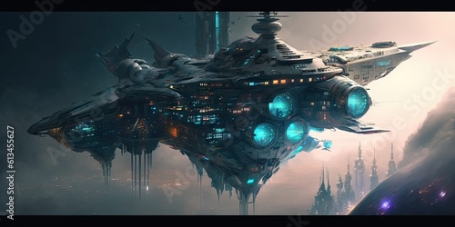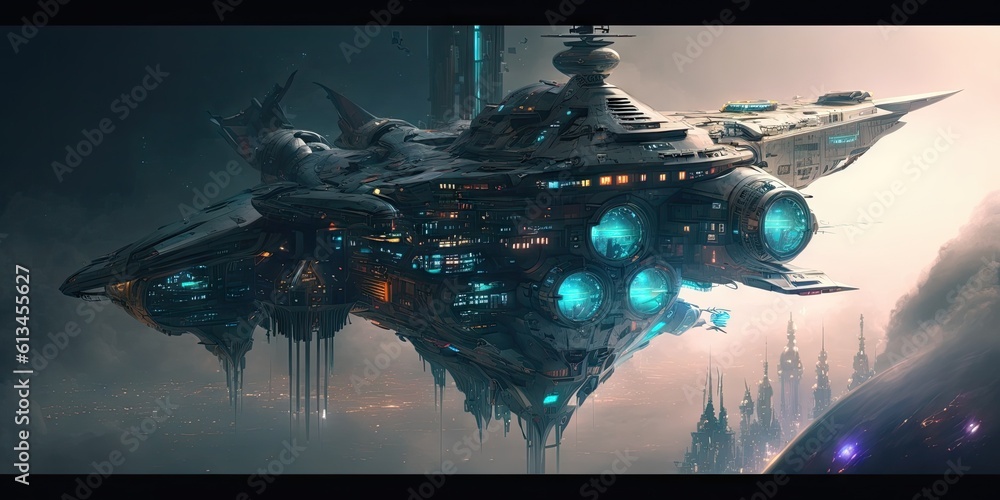 The watermark will not be included on Canvas Print.: Cyber punk spaceship seen from above - glorious generative ai -