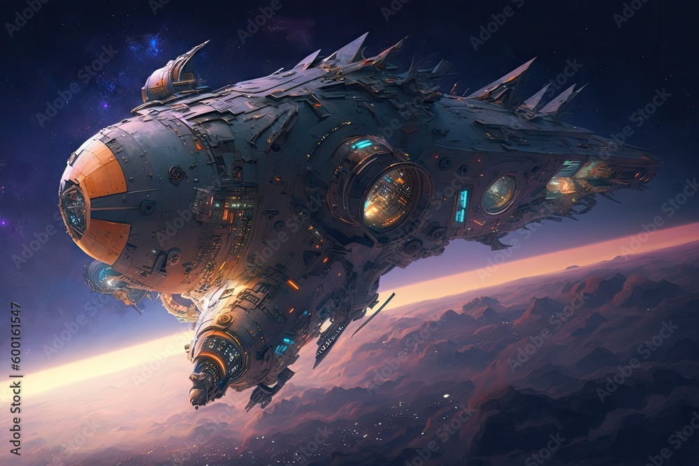 The watermark will not be included on Canvas Print.: Cyber punk spaceship seen from above - glorious generative ai -