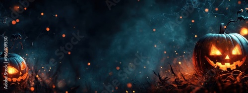 Canvas Print : Dark background with halloween pumpkins illuminated by lights, banner for copy space on the right si
