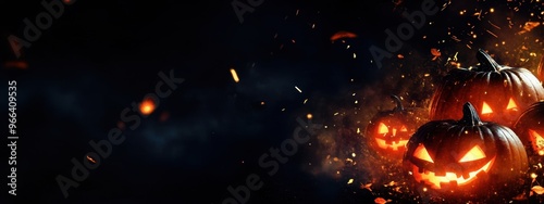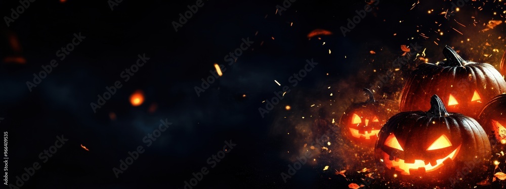 The watermark will not be included on Canvas Print.: Dark background with halloween pumpkins illuminated by lights, banner for copy space on the right si