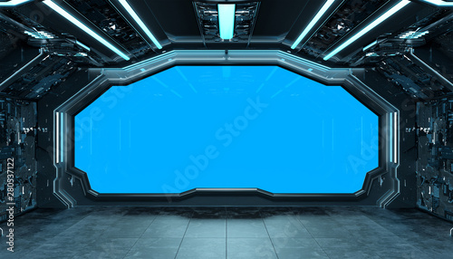 The watermark will not be included on Canvas Print.: Dark blue spaceship futuristic interior mockup with window 3d rendering