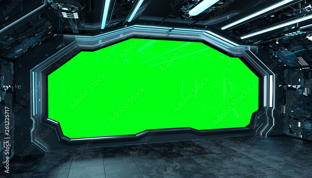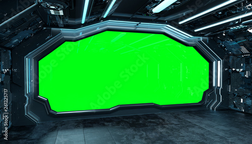The watermark will not be included on Canvas Print.: Dark blue spaceship futuristic interior mockup with window 3d rendering