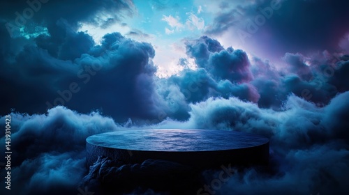 The watermark will not be included on Canvas Print.: Dark circular platform on clouds at twilight