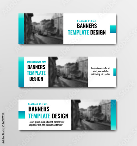 The watermark will not be included on Canvas Print.: Design of horizontal white banners with blue elements and space for photo -