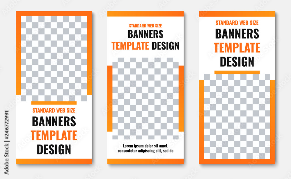 The watermark will not be included on Canvas Print.: Design of vertical vector white banners with photo frame and orange stroke -