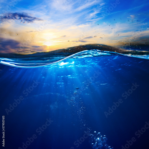 Canvas Print : Design template with underwater part and sunset skylight splitted by waterline
